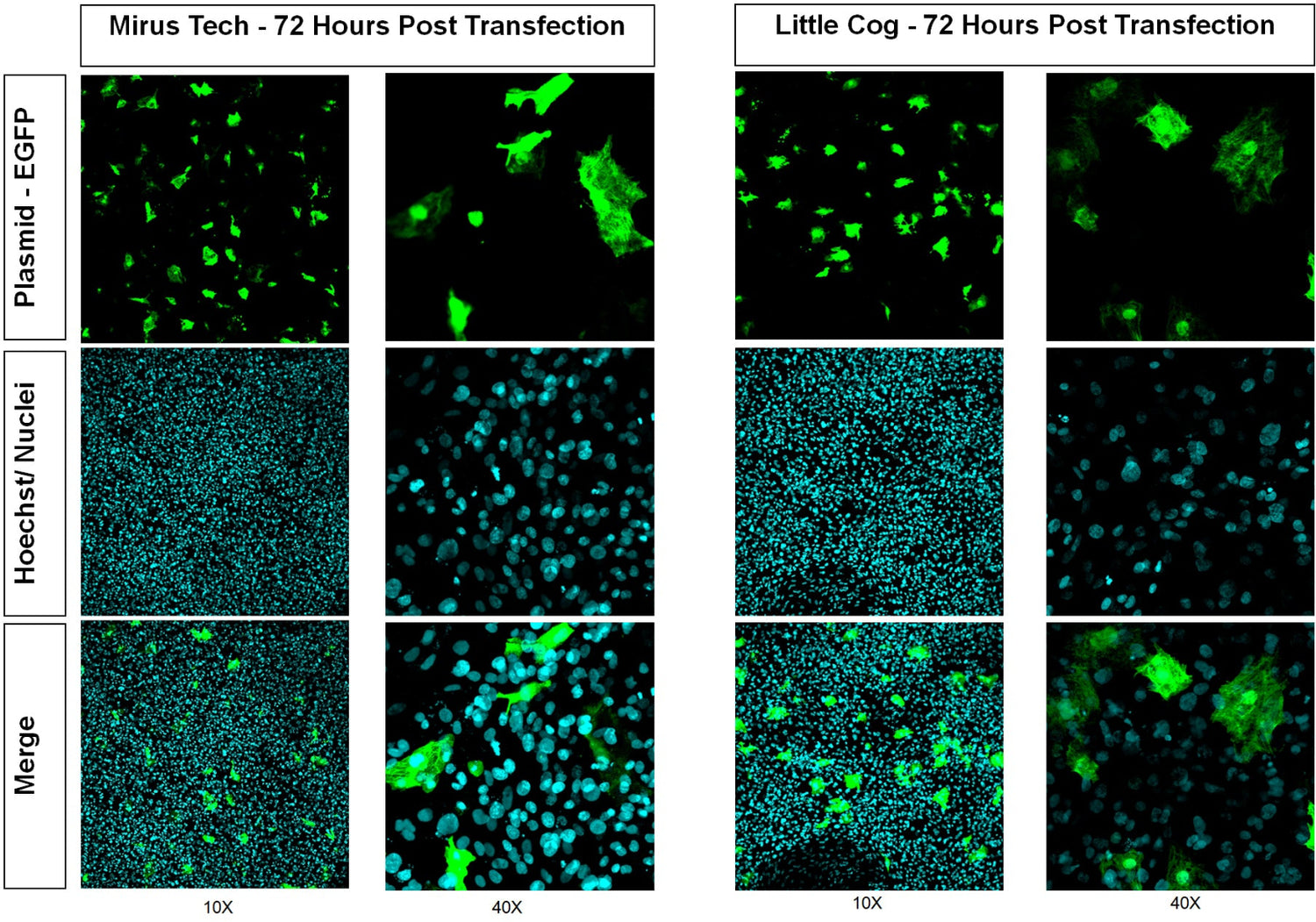 With Mirus, peak expression typically occurs ~72 hours post-transfection, whereas with Little Cog, expression was observed much earlier."